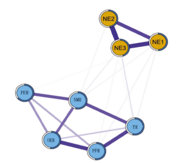 Objective To understand the relationship between nursing staff's risk perception and psychological health dimensions,analyze the core dimensions that affect mental health,and provide potential intervention targets for maintaining nursing staff's mental health. Methods From April 1,2022 to October 31,2023,a total of 2 546 nursing staff from 20 hospitals from east,west,south,north,and central regions were conveniently selected for investigation. Using a self-compiled general data questionnaire,a revised risk perception questionnaire for nurses and the 21-item depression anxiety and stress scale(DASS-21) as tools. The R software was used for statistical analysis and visualization,the network model was used to analyze the relations between the five dimensions of risk perception and the three dimensions of DASS-21,and to analyze the intensity and bridge-intensity centrality of each dimension in the network. Results In the network analysis of risk perception and mental health network,the association between "time risk" and "stress" "social mental risk" and "stress" were strong,their non-regularized partial correlation coefficients were 0.07 and 0.04,respectively. Analysis of strength and bridge-strength centrality showed that "stress" had the strongest strength centrality,with an expected influence(EI) of 0.13,and the two dimensions with the highest bridge-strength centrality were "stress" [bridge expected influence(BEI)=0.13] and "time risk"(BEI=0.11). Conclusion There are different correlation paths between various dimensions of risk perception and mental health. "Time risk" may be the core dimension affecting the mental health of nursing staff,and "stress" in mental health dimension may be the core symptom.