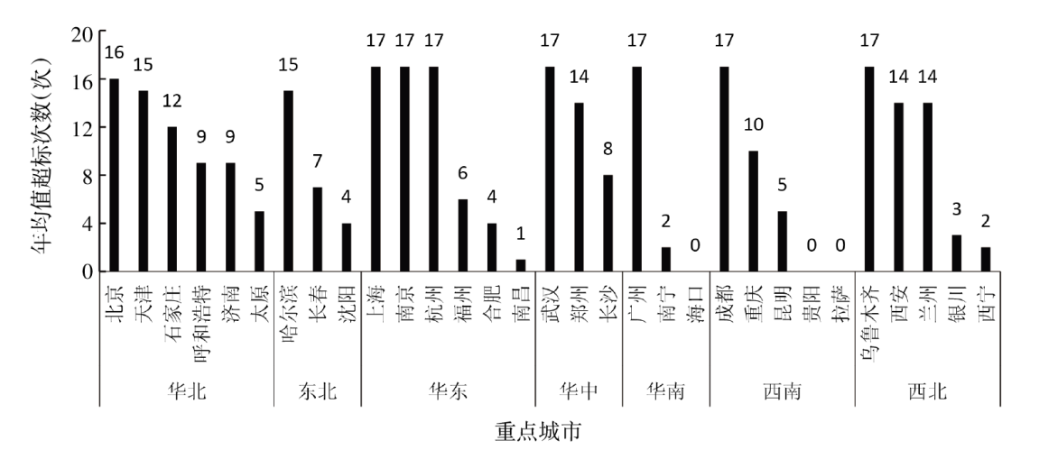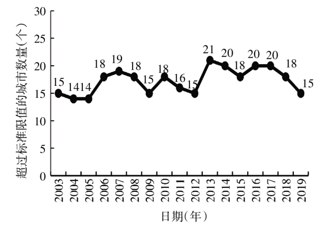 Objective To collect and organize the atmospheric nitrogen dioxide(NO2) pollution data in 31 key cities in China from 2003 to 2019,and analyze their changing trend. Methods Collect annual average mass concentration data of atmospheric NO2 in 31 key cities from 2003 to 2019 from the official website of the National Bureau of Statistics,and evaluate the annual average mass concentration of NO2 based on the limit standards in GB 3095-2012 "the Ambient Air Quality Standards". The Daniel trend test method was used to evaluate the annual trend of atmospheric NO2 mass concentration,and the Kruskal-Wallis H test was used to compare the differences of NO2 mass concentrations in different groups. Results The annual average mass concentration of atmospheric NO2 in 31 key cities from 2003 to 2019 was (41±12)μg/m3,with an annual average decline rate of 0.79%. There was no statistically significant difference in the annual average mass concentration of NO2 between different years(χ2=16.24,P>0.05). NO2 pollution was relatively mild in Southwest and South China,and more severe in North and Central China. The annual average mass concentration of NO2 in the Northwest China showed an upward trend(rs=0.710,P<0.01),while in the East China and South China,it showed a downward trend(rs=-0.757,-0.815,both P<0.01). Compared with 2003,the annual average mass concentration of NO2 in 18 cities in 2019 showed varying degrees of decline,with a decrease of 2% to 51%(an average annual decrease rate of 0.1% to 4.3%),the annual average mass concentration of NO2 in 8 cities(including Hefei,Taiyuan,Changchun,Xi'an,Zhengzhou,Xining,Guiyang,and Shijiazhuang) increased by 5% to 68%(an average annual growth rate of 0.3% to 3.3%),and the annual average mass concentration of NO2 remained the same in 5 cities(Shenyang,Nanchang,Haikou,Lanzhou,and Yinchuan). The trend test results showed that the annual average mass concentration of NO2 in 9 cities(Shijiazhuang,Taiyuan,Hefei,Jinan,Zhengzhou,Guiyang,Xi'an,Xining,and Yinchuan) showed an upward trend(all rs>0,all P<0.05),while in 10 cities(Beijing,Harbin,Shanghai,Nanjing,Hangzhou,Fuzhou,Guangzhou,Kunming,Lhasa,Urumqi),the annual average mass concentration of NO2 showed a downward trend(all rs<0,all P<0.01). From 2003 to 2019,the annual average mass concentration of NO2 in seven cities(Shanghai,Nanjing,Hangzhou,Wuhan,Guangzhou,Chengdu,and Urumqi) exceeded the standard limit every year,while three cities(Haikou,Guiyang,and Lhasa) had good quality and were within the standard limit every year. Conclusion There are regional and urban differences in atmospheric NO2 pollution in 31 key cities in China,with heavy pollution in North China,Central China,and Northwest China. The situation of NO2 prevention and control in Beijing-Tianjin-Hebei and its surrounding areas,the Yangtze River Delta,the Pearl River Delta,and western cities remains severe. In the future,comprehensive treatment measures,"tailored measures",and regional coordinated prevention and control should continue to be taken for NO2 pollution.