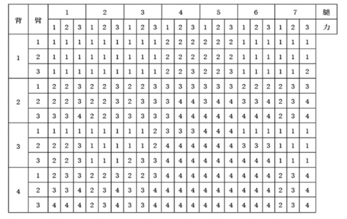 | 编码 | 背部 | 手臂 | 腿部 | 重量负荷(kg) |