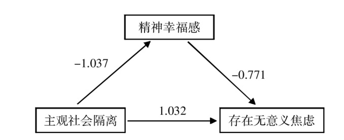 | 主观社会隔离→存在无意义焦虑(总效应) | 1.832(1.134~2.530) | 0.355 | 100.0 |