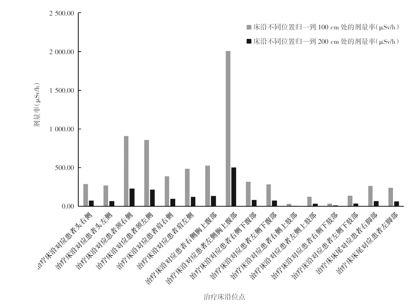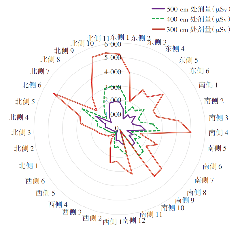 | 测量点位置 (与靶点相对位置) | 与照射野中心 距离(cm) | 布点处实测累积 剂量(μSv) | 归一到不同距离处的累积剂量(μSv) | 归一到不同距离的剂量率(μSv/h) | ||||||