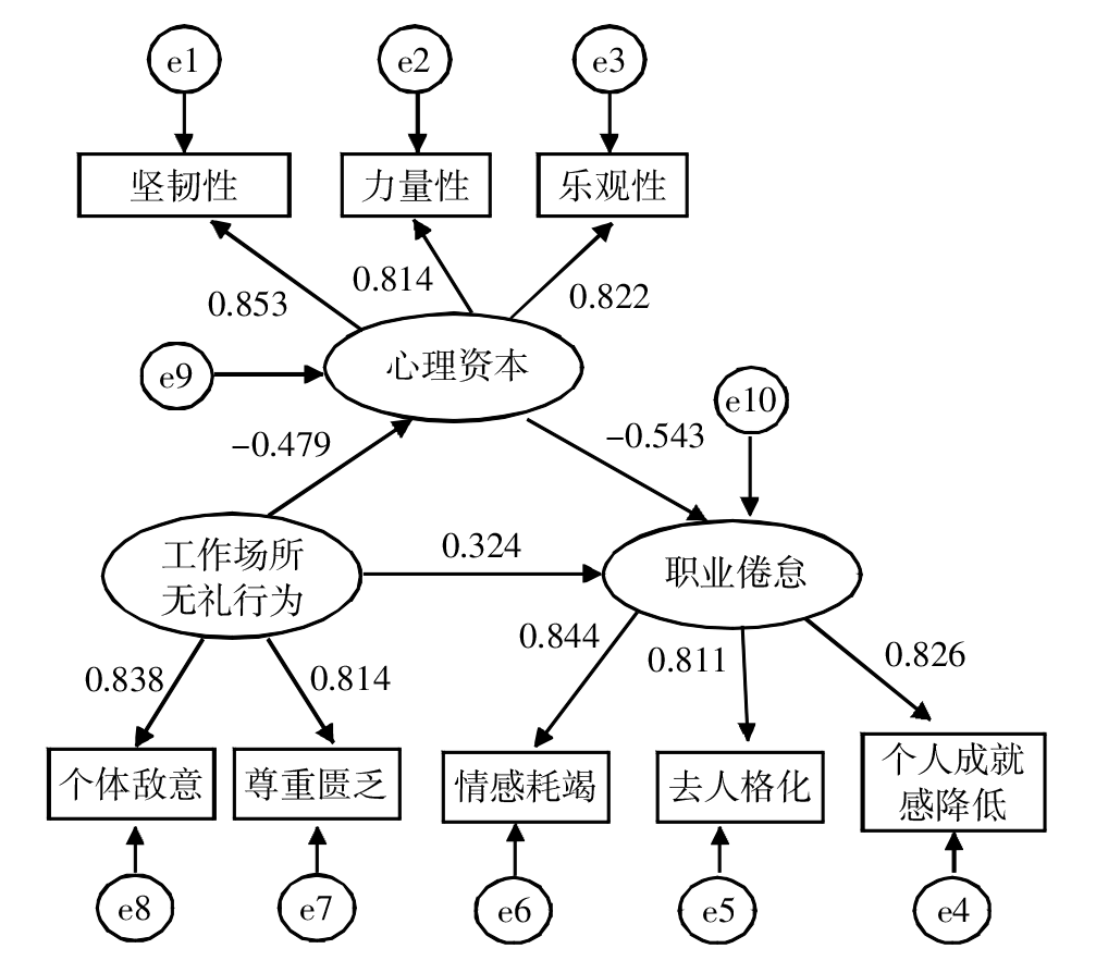 | 方程1 | 职业倦怠(Y) | 工作场所无礼行为(X) | Y=0.584X(c=0.584) | 0.039 | 14.974 | <0.01 |