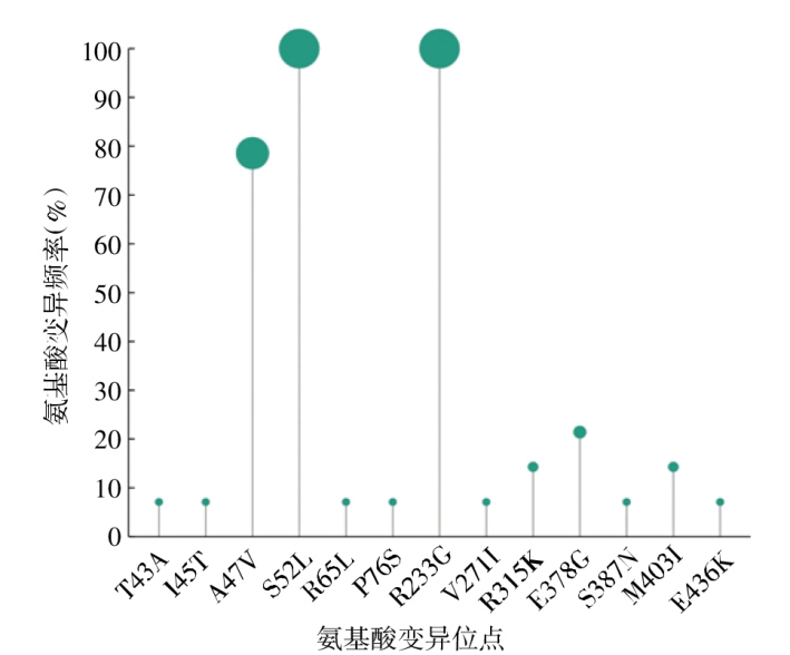 | T43A | I45T | A47V | S52L | R65L | P76S | R233G | V271I | R315K | E378G | S387N | M403I | E436K | |