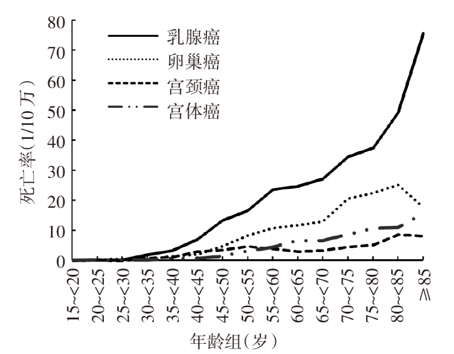 Objective To analyze the disease burden and premature mortality probability of breast cancer and common malignant cancers of the reproductive system among females in Chaoyang District of Beijing City,and to provide decision-making basis for formulating relevant prevention and control strategies. Methods The death registration data of female registered residents in Chaoyang District of Beijing City from 2003 to 2022 in the Beijing Death Registration and Reporting Information System were collected,and statistical indicators such as population mortality,standardized mortality,years of life lost(YLL),premature mortality probability and their average annual percent change(AAPC) for breast cancer and common malignant cancers of the reproductive system were analyzed. Excel 2016,SPSS 17.0 and Joinpoint 4.6.0.0 software were used for statistical analysis. Results From 2003 to 2022,the numbers of deaths from breast,cervical,uterine and ovarian cancers in women in Chaoyang District of Beijing City were 2 701,481,578 and 1 255 cases,respectively,and the crude mortality rate showed an upward trend(AAPC=2.490%,4.904%, 4.775%,5.544%,all P<0.01). Age-specific mortality rates for breast,cervical,uterine and ovarian cancers showed an upward trend(AAPC=69.100%,43.286%,50.854%,44.424%,all P<0.01). The probability of premature mortality for cervical,uterine and ovarian cancers showed an upward trend(AAPC=4.343%,3.062%,3.945%,all P<0.05).The YLL rates of cervical,uterine and ovarian cancers showed an upward trend(AAPC= 4.093%,4.291%,4.408%,all P<0.05). The crude mortality and YLL rates of breast cancer in the age group of ≥80 years showed an upward trend(AAPC=3.888%,3.538%,both P<0.01),the crude mortality and YLL rates of cervical cancer in the age group of 50-<60 years showed an upward trend(AAPC=8.643%, 8.545%,both P<0.05),the crude mortality rates of ovarian cancer in the age groups of 50-<60 and 60-<70 years showed an upward trend(AAPC=3.993%,5.450%,both P<0.05),and the YLL rate in the age groups of 60-<70 years showed an upward trend(AAPC=5.457%,P<0.05). Conclusion From 2003 to 2022,the burden of breast cancer and common malignant cancers of the reproductive system in women in Chaoyang District of Beijing City are increasing,and the government should strengthen the prevention and control of breast cancer and common malignant cancers of the reproductive system. The mortality rate and YLL rate of ovarian cancer are higher than those of cervical and uterine cancers,so more attention should be paid to the prevention and control of ovarian cancer.