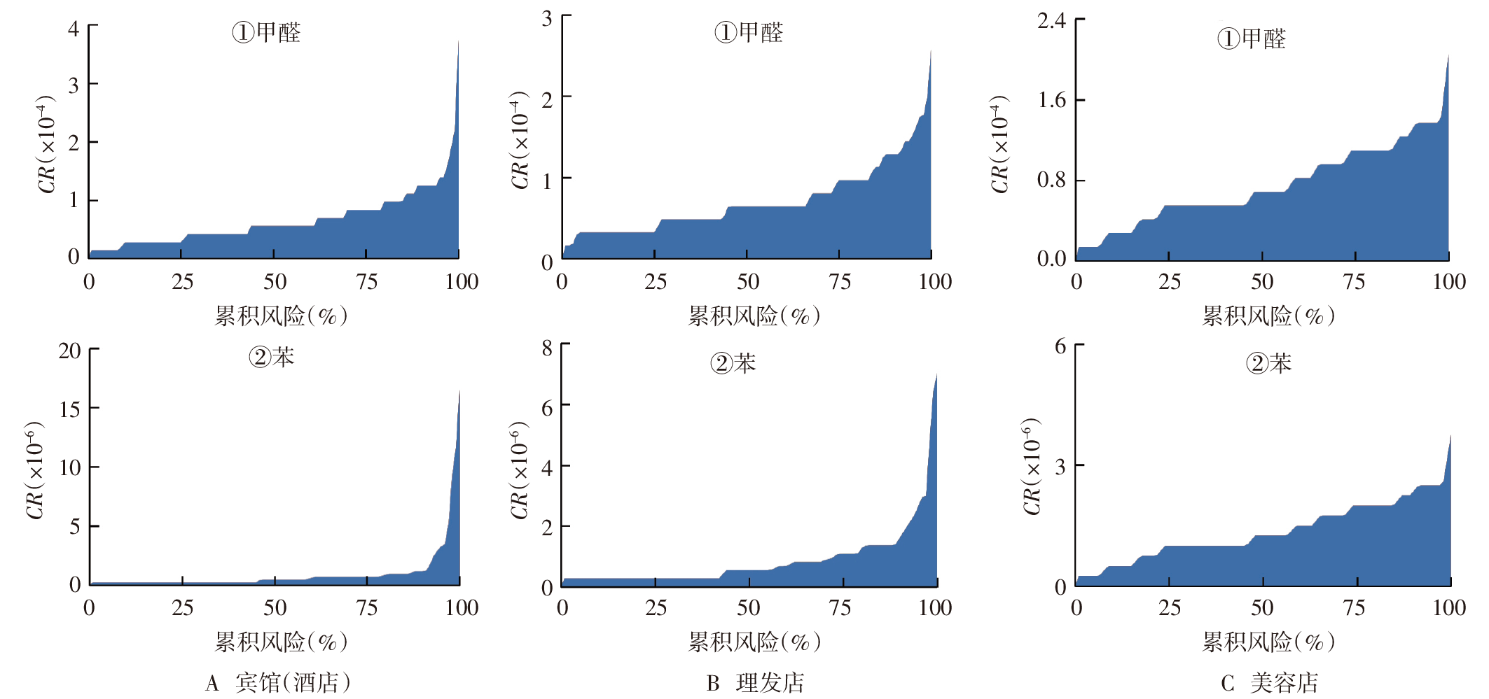 Objective To investigate the pollution status of common chemical pollutants in the indoor air of public places in four cities of Shaanxi Province and analyze the health risks to the employees. Methods In 2023,samples of chemical pollutants(formaldehyde,ammonia,benzene,toluene,and xylene) in the indoor air of three types of key public places,namely hotels,barber shops,and beauty salons,in four cities of Shaanxi Province were collected and tested. The exposure levels of indoor air pollutants were analyzed. The health risk model recommended by the United States Environmental Protection Agency(USEPA) was adopted to evaluate the health risks of chemical pollutants in the indoor air of public places to the employees. Results The indoor air contents of benzene,toluene and xylene in all kinds of public places did not exceed the standard,and the over-standard rate of formaldehyde was 3.81%,4.17% and 2.13%,respectively,with no statistically significant difference(χ2=0.383,P>0.05). The over-standard rate of ammonia in barbers was 5.56%. Formaldehyde in indoor air of different places all posed carcinogenic risks to employees,with a median concentration of 10-6 to 10-4 and a maximum concentration of >10-4. The carcinogenic risk of benzene in all kinds of places was relatively low,the risk value of the median concentration was <10-6,and the risk of the maximum concentration was >10-6. The median concentration HQ of formaldehyde in the indoor air of hotels,barbershops and beauty shops were >1. There were 238(56.67%),40(55.56%) and 25(53.19%) monitoring points HQ>1 in the 3 types of places,respectively. The HQ of benzene,toluene,xylene and ammonia in indoor air in various places were <1. Conclusion Formaldehyde in indoor air in public places has carcinogenic risk and non-carcinogenic risk to employees,and benzene has certain carcinogenic risk,which should be paid attention to.