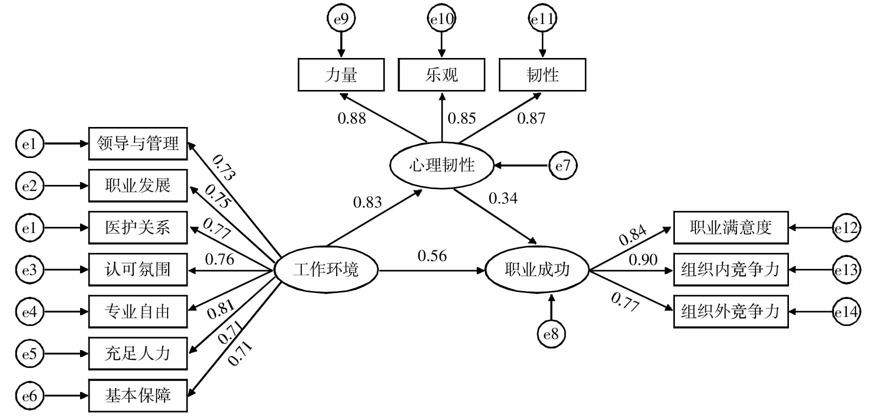 | 心理韧性→工作环境 | 0.833 | 0.148 | 16.43 | <0.01 |